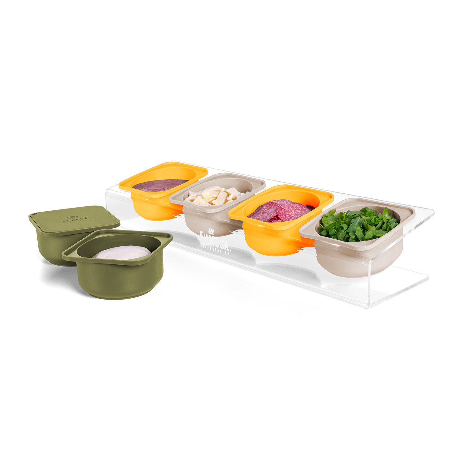 Passend zu deinen Babadoh Silikonbehältern unterstützt dich diese Pizzastation bei der Zubereitung. Gefertigt aus stabilem Plexiglas bietet die Pizzastation vier maßgeschneiderte Öffnungen für Babadoh Behälter, die dadurch einen sicheren und stabilen Halt haben. Die leichte Neigung der Station ermöglicht einen optimalen Zugriff auf den Inhalt, was die Nutzung besonders praktisch macht – perfekt für jede "Home-Pizzeria". Die Station bietet Platz für vier der sechs Babadoh Behälter und ist somit kompakt gestaltet, um weniger Platz auf der Arbeitsfläche zu beanspruchen. Die restlichen beiden Behälter können beispielsweise zur Aufbewahrung von Teiglingen genutzt werden.
