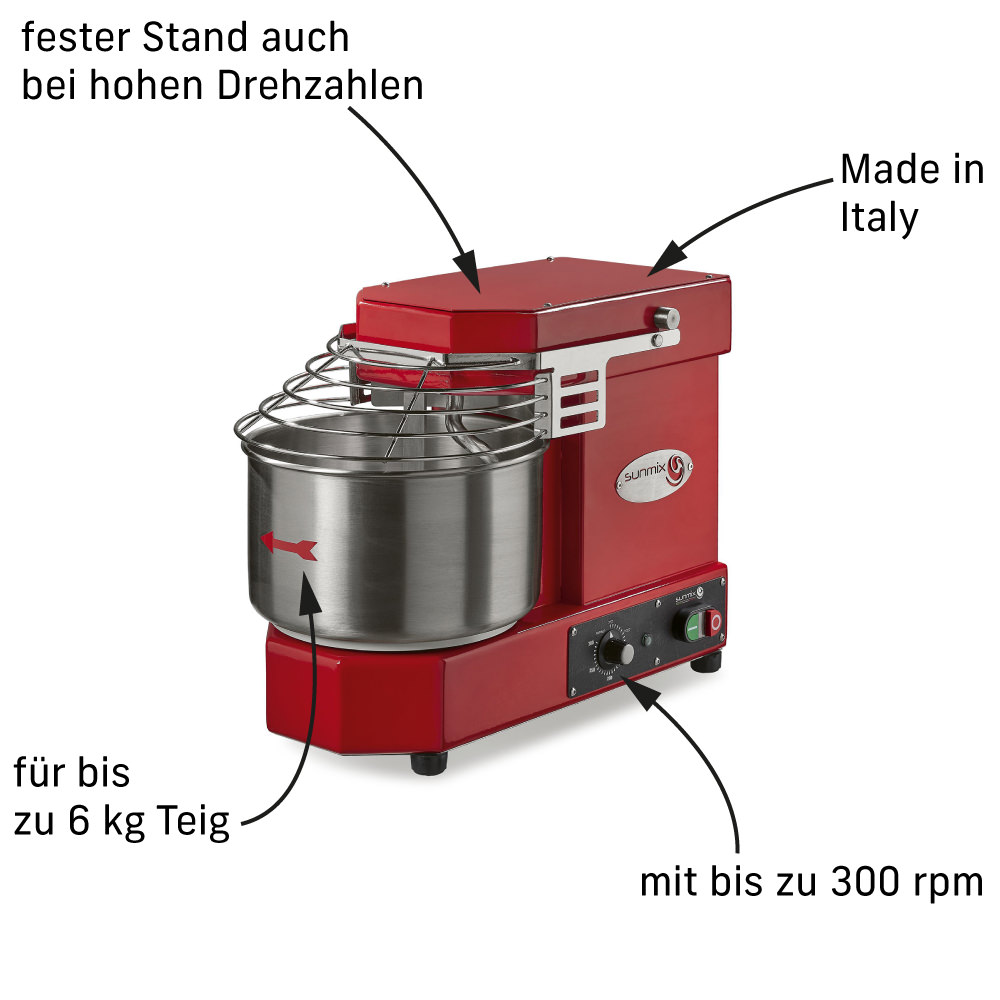 Die Spiral-Knetmaschine SUN6 aus dem Hause Sunmix ist ein Gerät für anspruchsvolle Privatanwender, die auch zuhause Teig wie ein echter Profi herstellen wollen. So kannst du in dem Edelstahl-Kessel mit einem Fassungsvermögen von 8 l und einer Kapazität von bis zu 6 kg, Pizza-, Brot- sowie viele andere Teige bequem auskneten. Die max. Geschwindigkeit von 300 rpm erlaubt es dir, auch sehr hoch hydrierte Teige (um die 80 % Hydration) für Focaccia, hoch hydrierte Blechpizzen oder Ciabatta zu kneten.